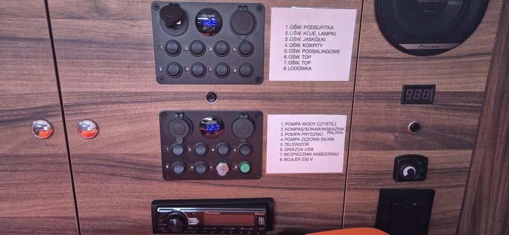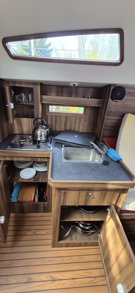 Wyposażenie nawigacyjne: log, autopilot, kompas, ploter z echosondą, GPS, radio VHF
